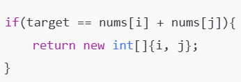 Next on is method if which is searching proper numbers by comparing int target to 2 numbers from nums array with index i and j.